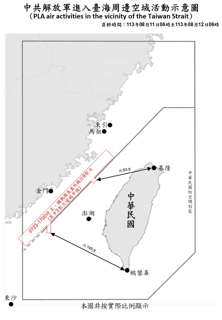 根據國防部今公布的「中共解放軍進入臺海週邊空域活動示意圖」顯示,昨07時23分至17時00分,有主、輔戰機及直升機共9架次,在臺灣海峽中線附近活動,其中3架次逾越中線,最近時距離基隆93浬、鵝鑾鼻145浬;國防部強調,國軍運用任務機、艦及岸置飛彈系統嚴密監控與應處。