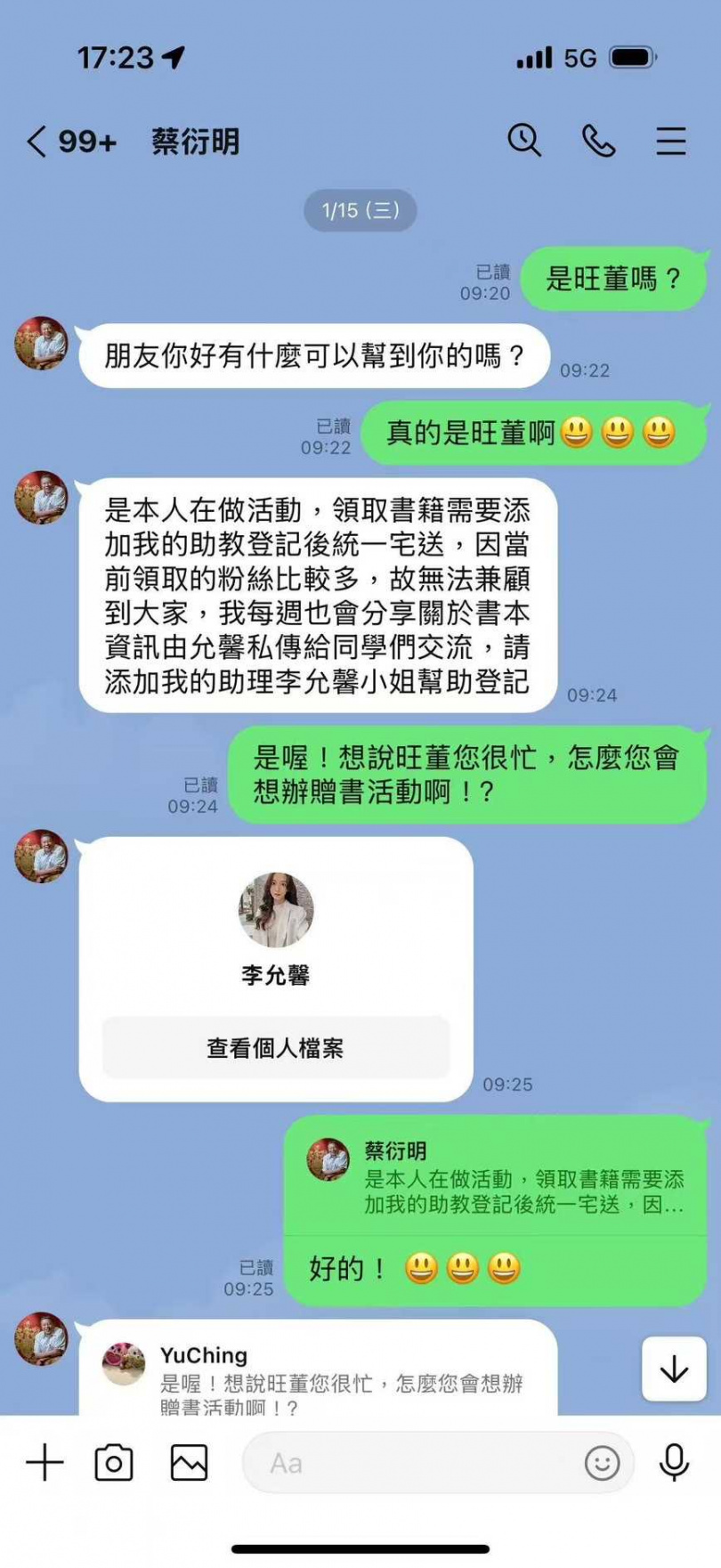 而實際有人添加貼文中的聯繫方式後,則被引導加入至一個名為「蔡衍明」的LINE帳號中。在面對網友的詢問「是旺董嗎?」詐團份子還煞有其事地回應「是本人在做活動,領取書籍需要添加我的助教登記後統一宅送,因當前領取的粉絲比較多,故無法兼顧到大家,我每週也會分享關於書本資訊由允馨私傳給同學們交流,請添加我的助理李允馨小姐幫助登記」。