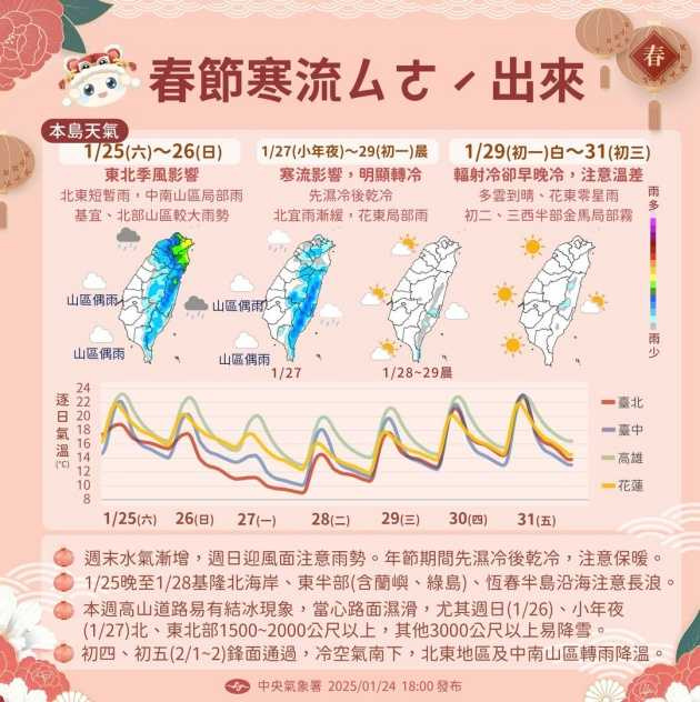 氣象署提醒,周末各地偏涼,明(26日)晚起寒流,各地都會很寒冷,尤其小年夜至初一清晨中部以北、東北部易有10度以下低溫;周末北部、東半部很容易下雨,中南部山區偶飄雨,小年夜降雨漸緩,除夕至初三進一步轉乾,天氣穩定可見陽光。