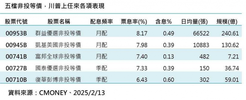 法人表示,因應川普2.0的不確定因素升溫,市場對降息預期收斂,避險需求增溫,提供收益的債券型ETF中的非投等債存續期間短,受利率影響程度低,吸引股民關注「高債息與低存續期」債券ETF。