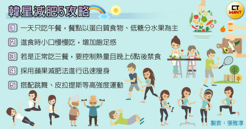 韓國人氣女團BLACKPINK的Rosé近來以新歌《APT.》暴紅,Rosé的纖細身材也引起話題,尤其是19吋的「螞蟻腰」,跳舞更顯搖曳生姿。Rosé曾自曝維持身材的祕訣也是一天只吃午餐,而且份量十足,包括白飯、鮭魚、雞肉或牛肉等蛋白質、大量蔬菜、泡菜,水果也選擇低糖分的蘋果、藍莓。