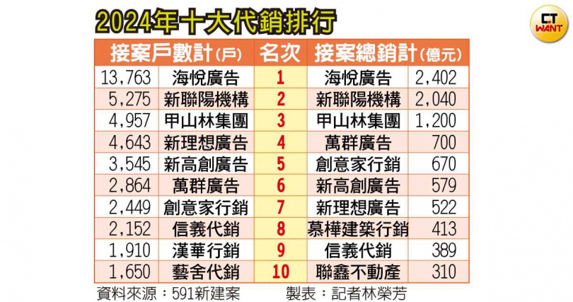 2024年上半年各地房價屢創新高,下半年限貸令號角響起,再搭配「史上最嚴打房」的第七波信用管制突襲,幸好業者早在上半年就已賺完整年「扣打」。「2024十大代銷」出爐,龍頭毫無懸念續由海悅廣告蟬聯,新聯陽則是去年接案大爆發,一口氣接下5個百億大案,一舉超車甲山林成為代銷二把手。