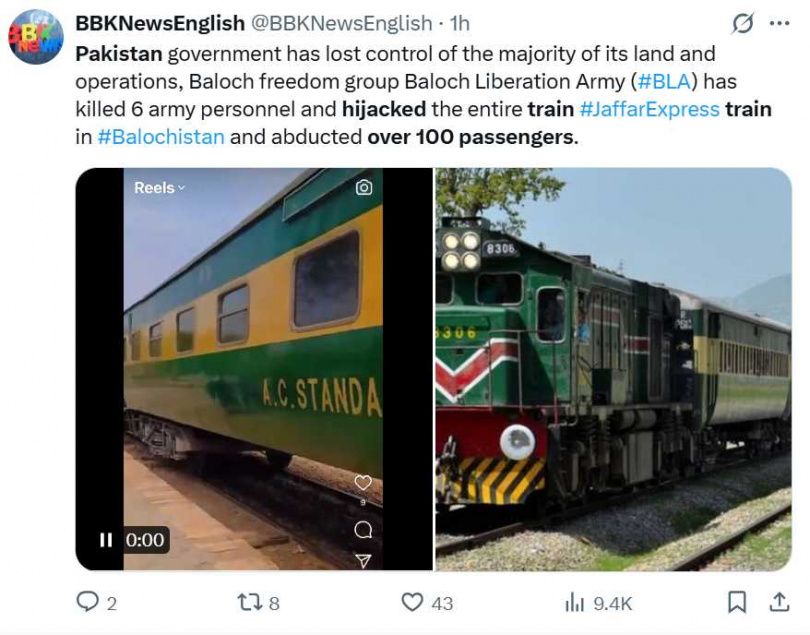 巴基斯坦11日發生一起列車遭到挾持的事件,這列載有450名乘客的列車被武裝分子挾持,武裝分子當時向列車開火,造成火車司機和多名乘客受傷。這起挾持事件發生後,俾路支解放軍(BLA)也出面坦承策劃了這場行動,稱已扣押超過100名乘客作為人質,其中包括巴基斯坦官方人員,甚至不排除處決所有人質。
