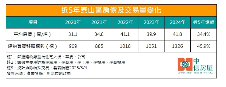 不僅如此,泰山區還擁有塭仔圳重劃區這一重大建設題材,加上規劃中的五股泰山輕軌,進一步提升了區域的房市能見度。根據內政部統計數據顯示,目前泰山的平均房價已攀升至每坪41.8萬元,相較於2020年的每坪31.1萬元,短短5年間漲幅高達34.4%,與此同時,區域建物買賣移轉棟數也從909棟大幅增加至1,326棟,成長幅度達45.9%,顯見泰山房市交易量能正持續升溫。