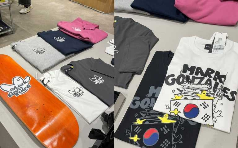 「Mark Gonzales」品牌標誌性的黃色小天使(Shmoo),象徵自由與滑板文化的精神,吸引韓星與潮流玩家爭相穿搭。門市內販售格紋襯衫、寬版工裝長褲、運動棉褲等單品,搭配韓國時尚圈熱愛的色調設計,讓滑板文化與潮流時尚完美融合。