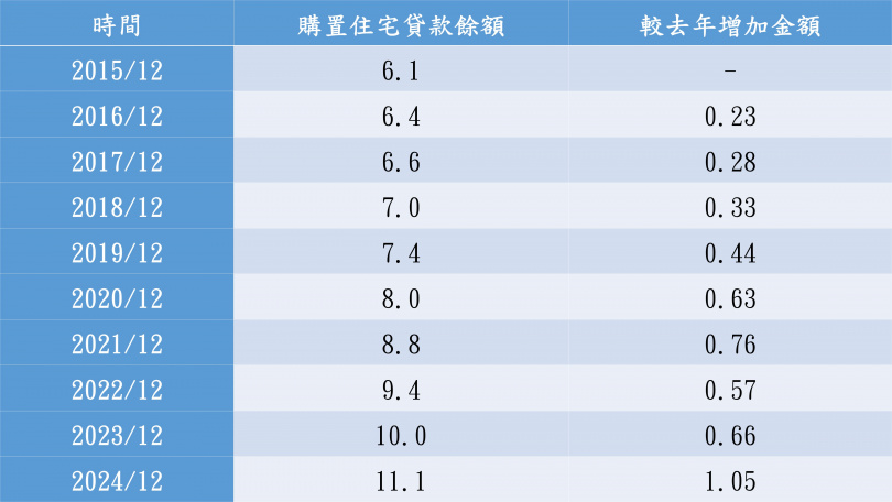 統計顯示,2015年底國內的購置住宅貸款房貸餘額為6.1兆元,到了2018年底才增加到7兆元,2020年底增加到8兆元,也經歷將近2年的時間,2022年底則增加到9.4兆元,2023年底則是達到10兆元,不過之後僅僅一年時間就增加了1兆元,到了2024年底就達到11兆元,這中間陸續有銀行放款接近滿水位,還有第四季央行政策踩煞車降溫,否則數字可能會更可觀。