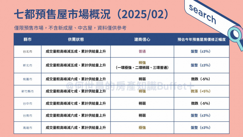 何世昌在個人粉專「何世昌的房產知識Buffet+」發文表示,如同先前預估,今年各縣市預售屋價格走勢將出現分歧,不再齊漲齊跌,房價的漲跌也與建商信心、財務與公司營運有不小關聯性,倘若建商信心脆弱,降價的機率便會升高。