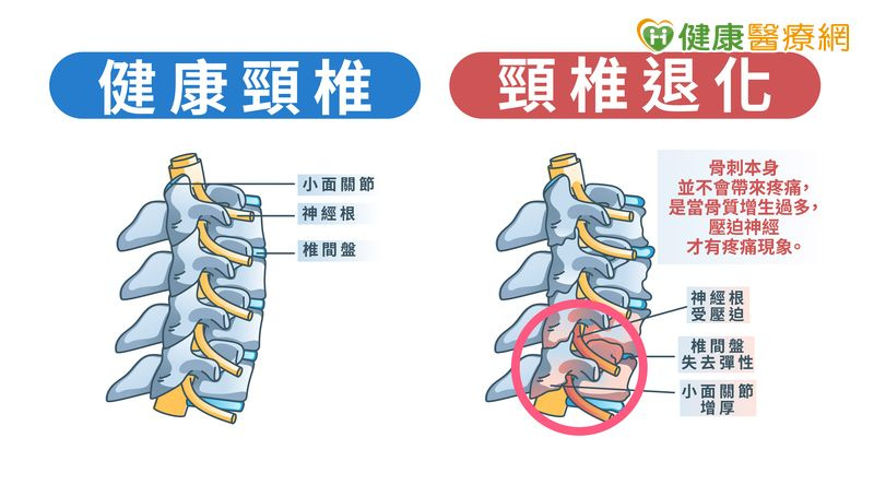 羅東博愛醫院脊椎微創中心黃安平醫師解釋,脊椎退化導致骨質增生,即俗稱的「骨刺」,若增生過度壓迫神經根,便會引發麻痛感。60歲以上長者近九成面臨頸椎退化問題,若有頸椎骨刺壓迫神經,初期症狀不明顯,麻痛無力感如「溫水煮青蛙」般緩慢侵蝕,一旦遭遇突發撞擊,恐致神經損傷,嚴重者甚至癱瘓,不可輕忽!