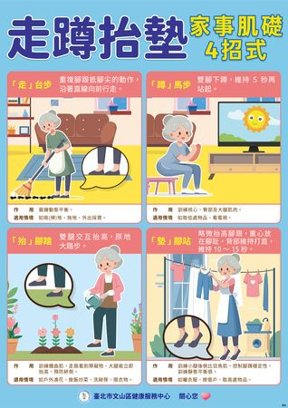 文山區健康服務中心主任陳幸宜表示,除了規律的運動訓練外,中心特別推出了一項針對長者的「家事肌礎」4招式,幫助長者在日常家事中輕鬆進行肌力與平衡的鍛煉,進一步達到防跌效果。