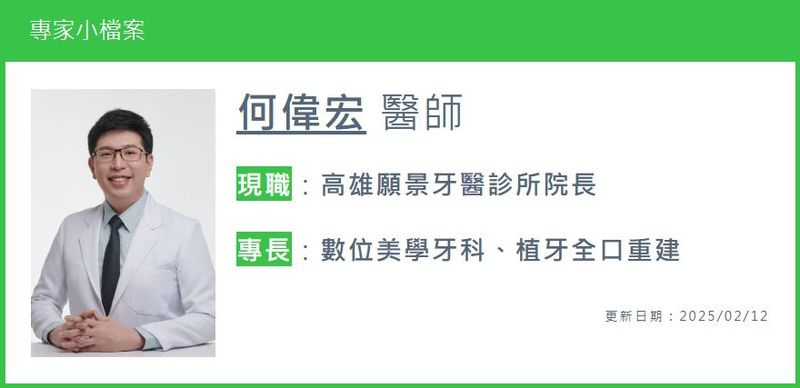 牙科診所何偉宏院長指出,缺牙不僅影響外觀,導致患者社交時缺乏自信,更會影響牙齒的正常功能。相鄰的牙齒會傾斜倒向缺牙的空間,造成齒列不齊或咬合不正。缺牙區域和周圍牙齒的骨頭也會逐漸流失,多顆缺牙則可能導致咀嚼及發音困難,牙齒受力不均也會進一步影響剩餘牙齒和牙周的健康,引發一連串的口腔健康問題。另外,齒列不齊使得牙縫變大,容易卡食物殘渣、不易清潔,增加內壁蛀牙和牙周病的風險。當缺牙、齒列不齊影響臉部美觀和牙齒功能時,醫師就會建議患者應進行治療。