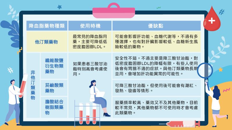 像是膽酸結合樹脂類藥物、菸鹼酸類藥物、纖維酸鹽衍生物類藥物等非他汀類藥物,都是在治療上可能會使用到的降血脂藥物,而不同的藥物也都有各自的療效以及副作用。