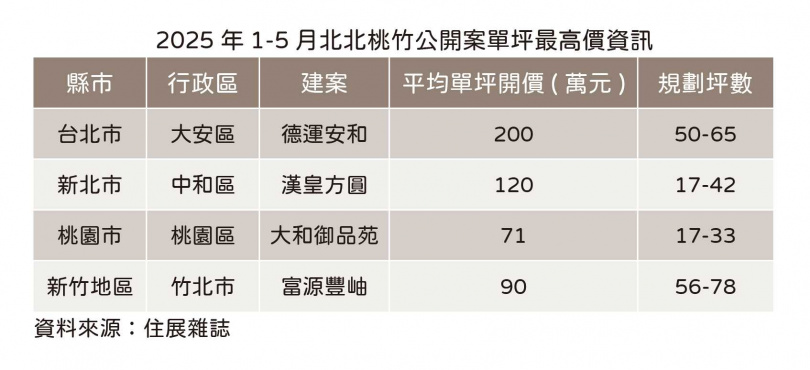 房市不景氣,市場新案開價受影響嗎?《住展》彙整今年1~5月北北桃竹亮相新案單坪開價最高資訊,台北市單價200萬俱樂部與新北市的百萬宅再添生力軍,台北市大安區遠企商圈「德運安和」平均每坪200萬元,新北市中和區捷運永安市場站生活圈的「漢皇方圓」平均單價衝上120萬元,桃園市鄰近藝文特區的「大和御品苑」均價71萬元,新竹地區為竹北市高鐵特區的「富源豐岫」均價90萬元。專家分析開價,桃園獨弱,其餘地區維持一定水準。