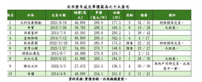觀察實價,北市前十名成交單價最高的豪宅雖動輒數億元,且成交單價基本站穩255萬元以上,但自2023年以來,該排行榜紋風不動,頂級豪宅少見新進者再創高單價。