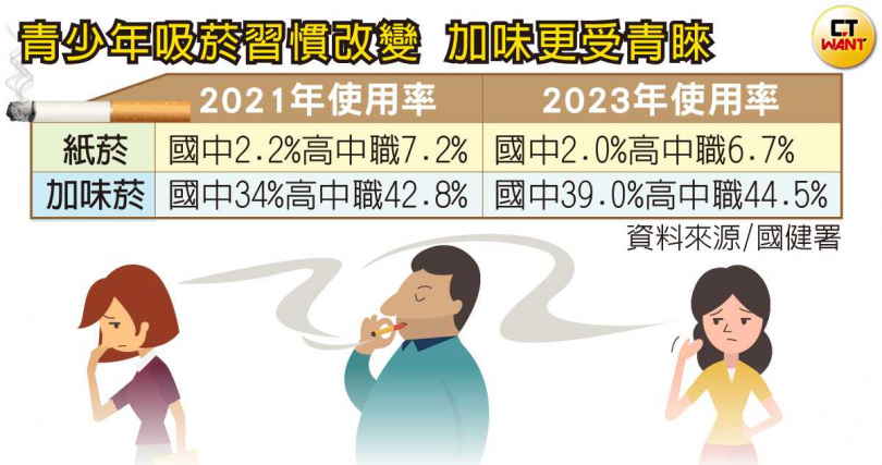 台灣社會也出現相同情況,國健署「2023年青少年吸菸行為調查」發現,每10個青少年吸菸者中就有4個使用加味菸,國中39%、高中職44.5%,相較於2021年國中34%、高中職42.8%更高,特別是女生的使用率高於男生(國中女43.8%、國中男36.7%;高中職女61.2%、高中職男37.2%)。