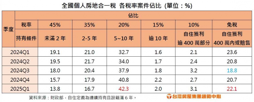 觀察2年內銷售「稅率45%」的案件占比,則從2024年Q4的15.7%,下滑至今年首季13.8%,季減少1.9個百分點,下降最多;持有2-5年的「稅率35%」占比也減至16.7%。