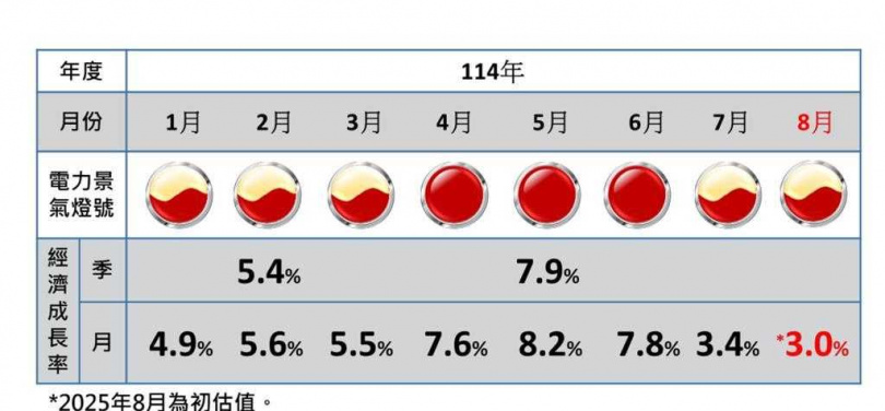 台灣綜合研究院24日發布8月份EPI電力景氣指數,全國高壓以上產業用電較去年同期成長1.12%,電力景氣燈號維持黃紅燈。台電高壓以上用電方面,8月份整體產業用電較去年同期成長0.6%,其中製造業用電成長0.31%,服務業用電成長1.41%。因此總體來看,預測2025年8月份經濟成長率為3.0%,和7月的3.4%沒有距離太遠。