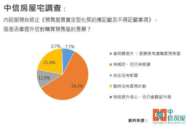 近一年來,建商停工與爛尾樓事件頻傳,也讓不少民眾對預售屋購買感到擔心。為保障消費者權益,內政部預告修正預售屋買賣定型化契約,不過根據中信房屋最新市調,僅7.7%民眾認為能明顯提升購買意願。