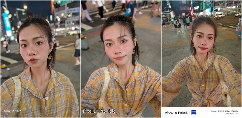 在日間人像的部分,以人像拍攝見長的vivo應該就是說絕對無敵,X Fold5的成品幾乎無可挑剔。比較讓人訝異的是,Pixel 10 Pro Fold的表現其實比Galaxy Z Fold7來的好,尤其在Model臉上的瑕疵、光影的處理上,Pixel 10 Pro Fold會比較討喜。