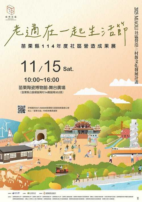 苗栗縣政府推動社區營造及村落文化發展計畫成果豐碩,將於 11月15日 在苗栗陶瓷博物館舉辦「114年度社區營造成果展——老適在一起生活節」。縣長鍾東錦於11月3日為活動啟動時表示,現在最重要的,就是讓長輩過著幸福、自在的生活,「大家一起在苗栗幸福慢慢變老」,並邀請民眾前來苗栗遊玩,見證各社區在地特色與創意成果。