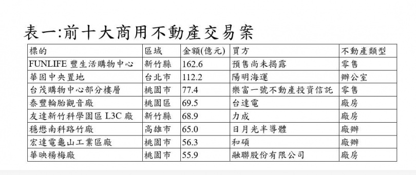 零售不動產則排名第三,交易總金額為272億,主要交易包括竹北豐生活購物中心的預售買賣案,以及樂富一號REITs購買台茂部分產權,分別貢獻162.6億及77.4億元。