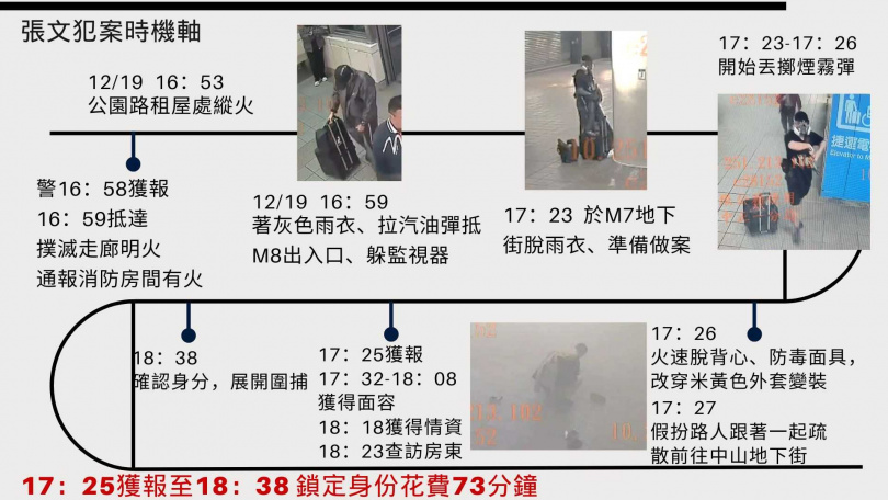 而中正一分局與捷運隊共同調閱監視器畫面,從張文縱火後於下午6時許8分許確認監視器拍下張文面容,6時18分許取得情資,23分查訪房東確認情資正確性,38分確認身分展開圍捕,全程緊耗時73分鐘。