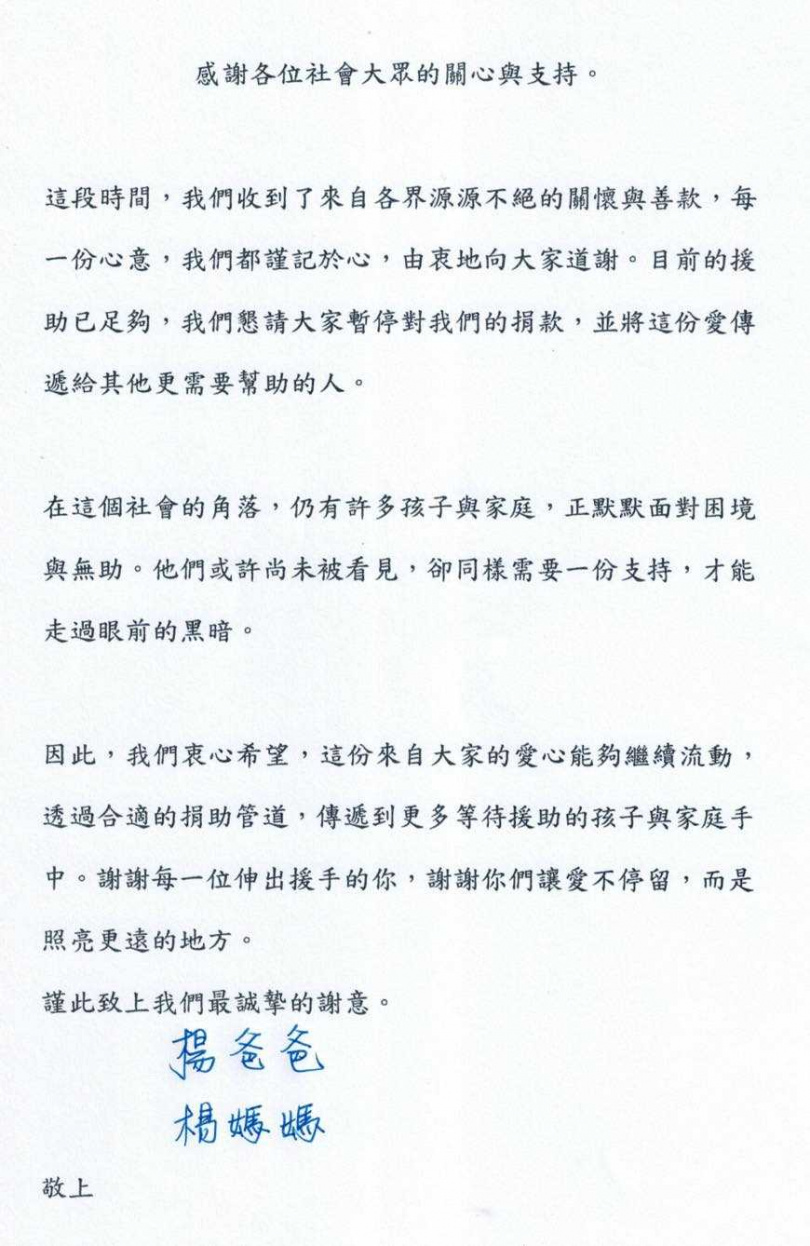 對此,楊爸爸、楊媽媽也發出聲明回應,同時感謝社會大眾的關心與支持: