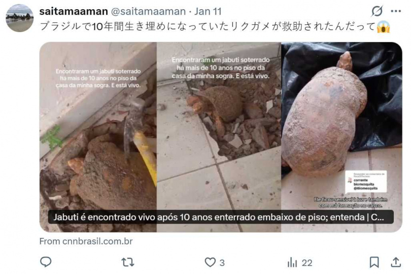 根據《CNN巴西》報導,這段救援過程最早由當地男子威爾森.科埃略(Wilson Coelho)在TikTok分享影片,畫面顯示這隻陸龜被從水泥地板底下挖出,據稱已受困長達十年。該影片迅速走紅,獲得超過45萬個讚。不過也有不少網友質疑「活埋十年」的說法是否屬實,原始貼文並未提供進一步說明。