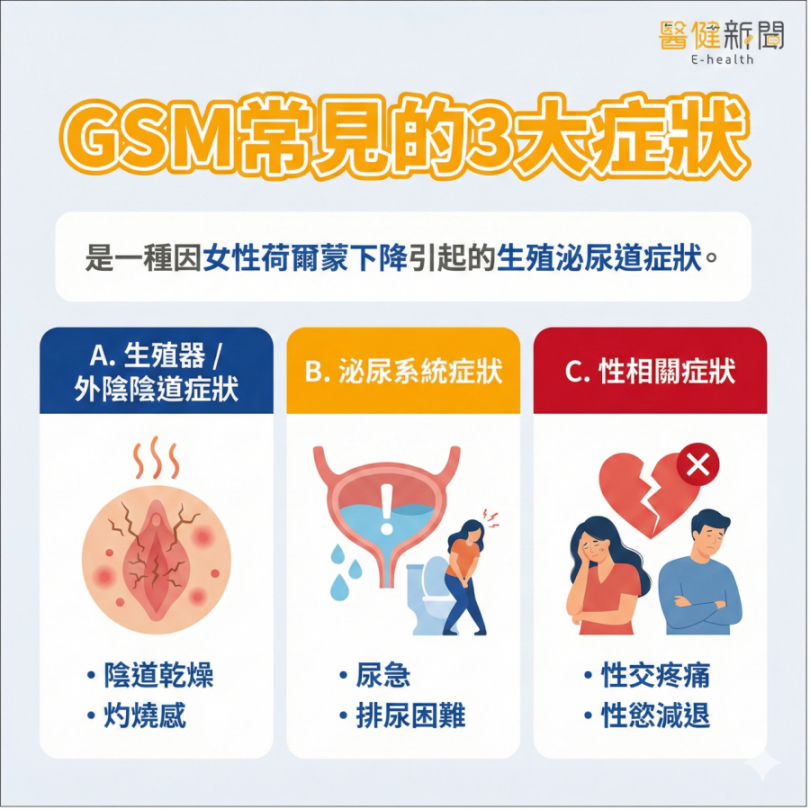 嚴絢上指出,根據全球研究顯示,GSM症狀盛行率極高,影響約84%的絕經後婦女。這些症狀通常從更年期後期開始出現並持續數年,包括: