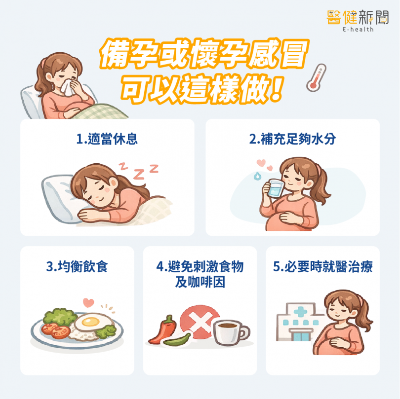 1.建議掛婦產科,就醫時主動告知:無論是備孕中或懷孕期間,若出現相關症狀,建議可以直接尋求婦產科醫師的協助,原因在於婦產科醫師較熟悉孕期安全用藥分級,也能同步檢查胎兒的健康,以確保感冒是否有影響宮縮或胎動異常。
