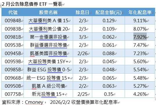 主動式、高股息、債券型等ETF陸續公布配息額、除息;其中,2月26日除息的主動群益台灣強棒ETF(00982A)預估年化配息率超過10%領先;3月3日除息的第一金優選非投債(00981B)配息0.062元,以今天收盤股價估算年化配息率約7.92%。