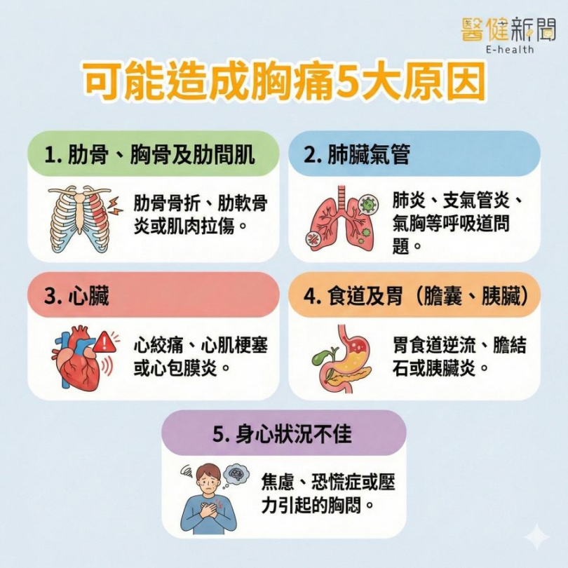 現代人生活壓力大、作息不正常,若非上述原因造成的胸痛,洪毓棋醫師指出,做完相關器官的檢查,發現四大方向與胸痛無關聯時,則會思考身心問題:焦慮恐慌,這類患者常會突然覺得胸悶吸不到空氣,會想用力呼吸,卻更覺得吸不到氣,最後變成過度換氣,伴隨手腳麻痺、流眼淚、頭昏等症狀。
