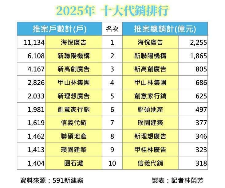 2025年房市落入低谷,有業者選擇保守應對,也有人趁亂突圍,根據591新建案統計「2025十大代銷」,龍頭毫無懸念續由海悅廣告蟬聯,新聯陽連2年緊追在後,也不太意外,但第三名卻起變化,新高創靠著承接寶佳建案的海量戰術,擠下老牌代銷甲山林。而因一把火燒掉接待中心、震驚各界的「華固譽誠」,則是短短3個月內已銷售150戶。