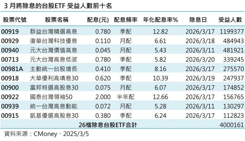 根據CMONEY統計,目前3月共有26檔台股ETF公布即將除息,其中包括群益台灣精選高息(00919)、FT臺灣永續高息(00961)、國泰台灣領袖50(00922)、中信綠能及電動車(00896)、大華優利高填息30(00918)共5檔年化配息率超過10%。
