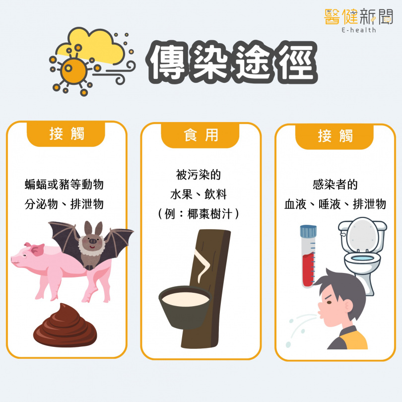 2.食物傳播:食用到受感染果蝠尿液或唾液污染的水果或生椰棗樹汁。