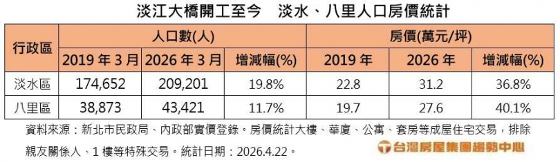被視為北海岸交通解藥的淡江大橋,終於將在5月12日通車,大橋兩端的淡水與八里,房市含金量也有所提高!台灣房屋統計2019年淡江大橋開工至今,淡水、八里的人口及房價變化,淡水從17.5萬人左右,成長到直逼21萬人,增加人數逾3萬人高居新北市之冠;人口基數較少的八里,也增加了4500多人。在房價表現方面,淡水區近7年來價漲36.8%,八里區漲幅更超過4成,房價與人口數據都頗具慶祝行情。